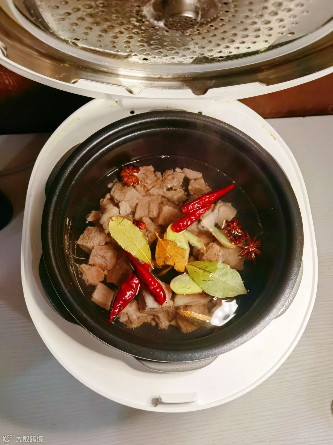 在高压锅里加入热开水,放入牛肉块,并加入干辣椒、香叶、八角、姜片、十三香和少许盐。高压炖煮40—50分钟。
