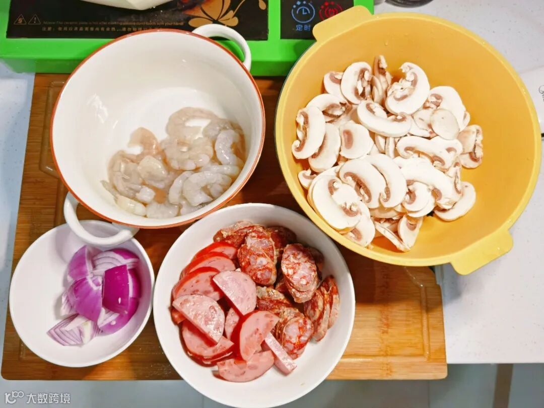 白蘑菇去杆切片,火腿肠和腊肠切片,洋葱切块。