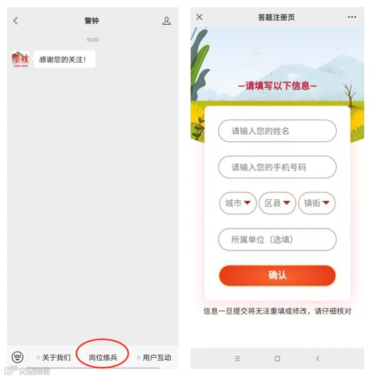 点击“警钟“公众号底部“岗位练兵",进入“答题注册页”填写相关信息,所属单位请填写“宁波舟山港集团”,然后提交进入答题页面。