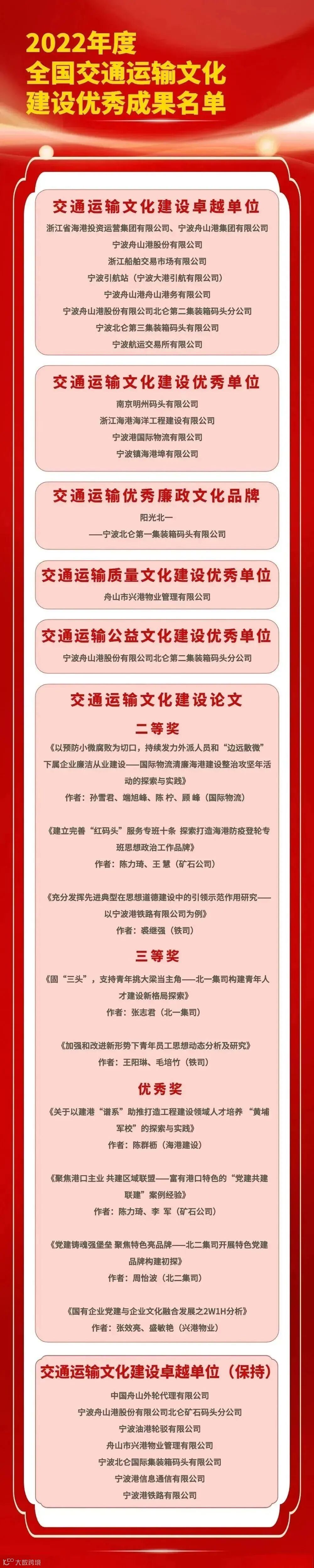 12月21日,中国交通企业管理协会印发《关于发布2022年度交通运输文化建设优秀成果的通知》(点击此处查看官方报道),浙江省海港集团、宁波舟山港集团荣获“2022年度全国交通运输文化建设卓越单位”称号,这是集团连续第12年获得该荣誉。