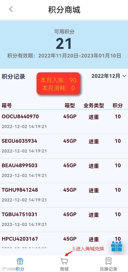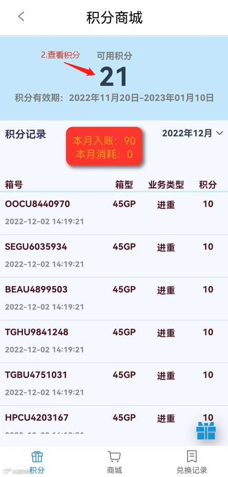 2022年10月20日00:00:00-2022年12月31日23:59:59期间,集卡司机师傅每成功完成一次宁波舟山港域码头(北一集司、北二集司、北三集司、梅东公司、大榭招商、甬舟公司)进重或提重操作,按照大箱10分、小箱5分累计业务积分。