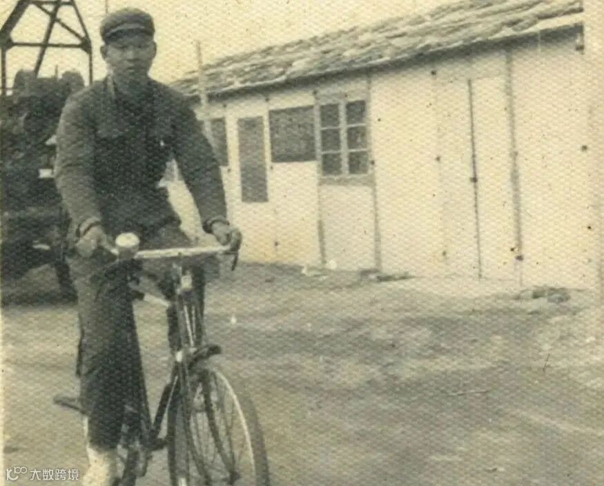 1978年初,北仑港建港指挥部工棚前骑着自行车的虞定云。
