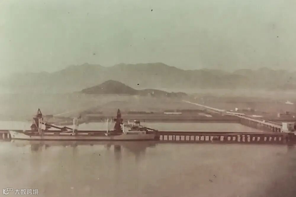 图为北仑港10万吨级矿石中转码头旧照。码头后方是林大山,虞定云的老家便在山脚下。