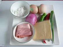 2:培根、洋葱、青红椒分别切成细丝,香葱切段。