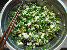 10:把豆腐和韭菜混合,调入少许盐、鸡精,淋入1汤勺熬熟但已冷却的香葱油,搅拌均匀。