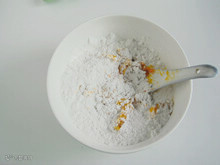 5、放入装有玉米面和奶粉的碗中拌匀。