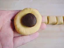 9:取一个揉圆后按扁,加入一个红豆沙丸子。