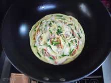 3:在蛋糊下锅40秒左右的时候,底部已经凝固了,此时便可以开始铺馅料,建议把火关了,以免动作不熟练,还没铺好,蛋饼已完全熟了。