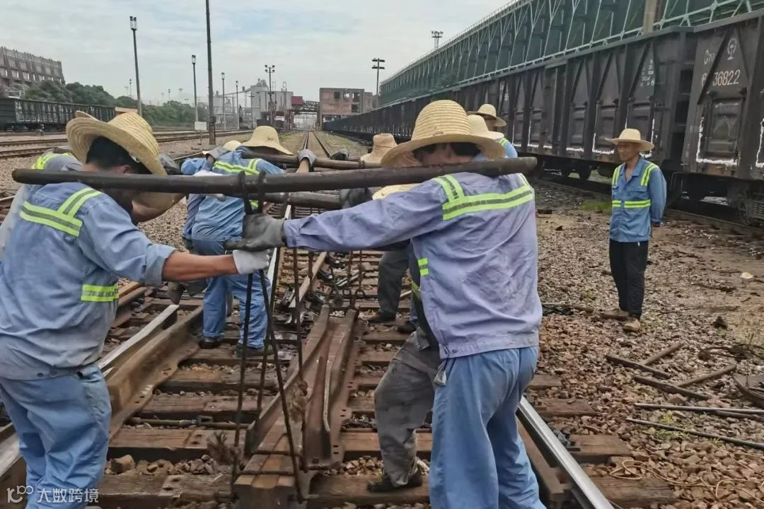 在35℃高温下,铁司北仑线路工区职工有序完成封锁线路、场内短驳、材料卸车、拆除伤件、更换新料等一系列工作,保障列车运行顺畅。
