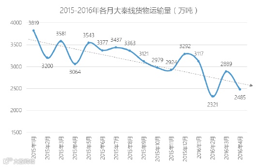 大秦线作为煤炭铁路运输的一条主干道,2016年的运营数据也不尽人意。根据大秦铁路公告,大秦线2016年4月货运量(以煤炭为主)2485万吨,同比减少18.9%。前4个月大秦线累计运量同比减少20.86%,突出反映了宏观经济需求的疲软。