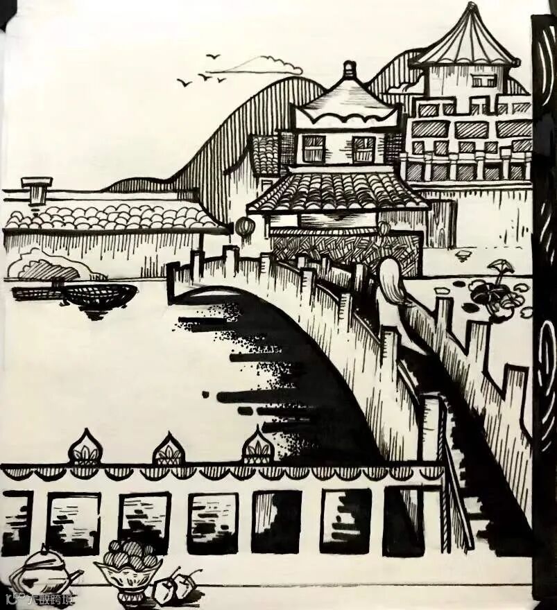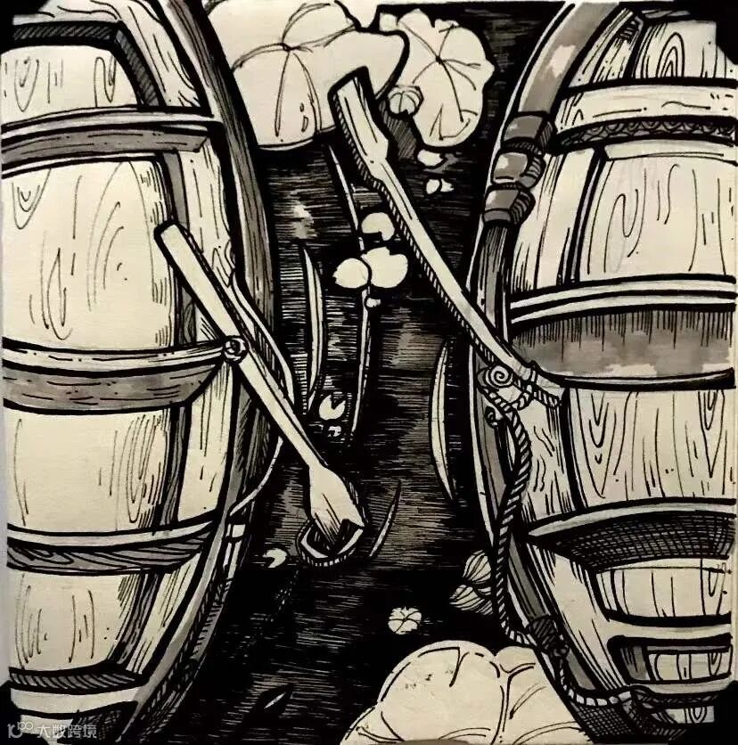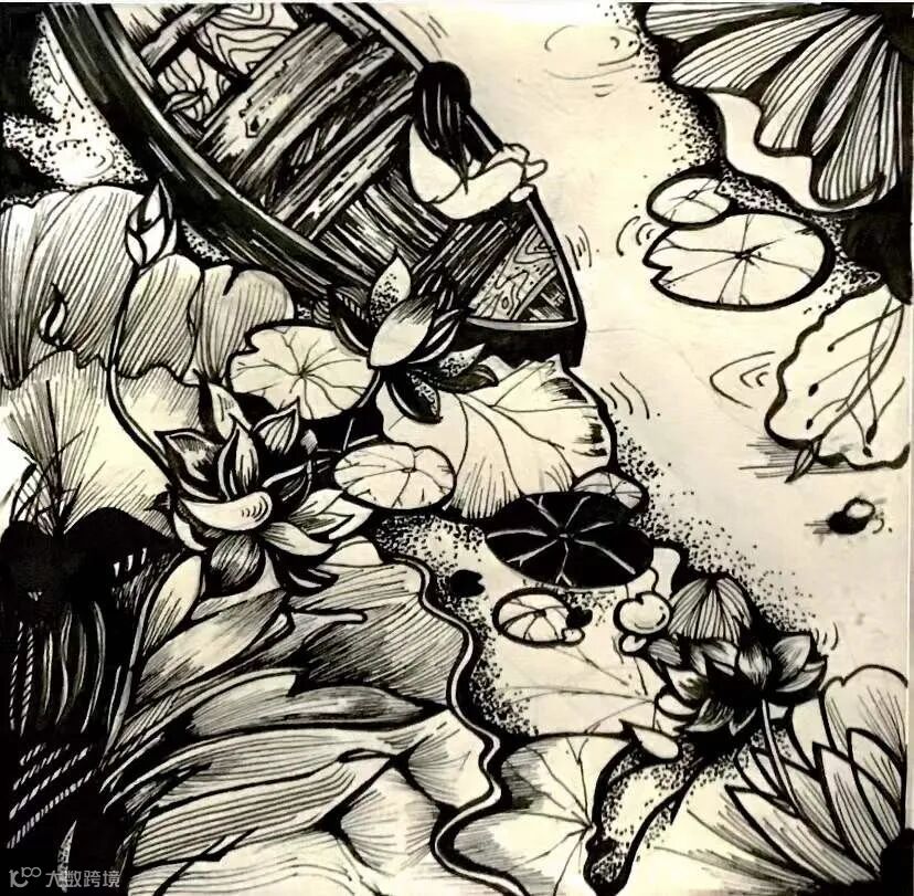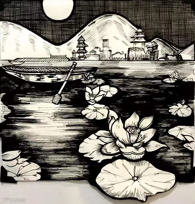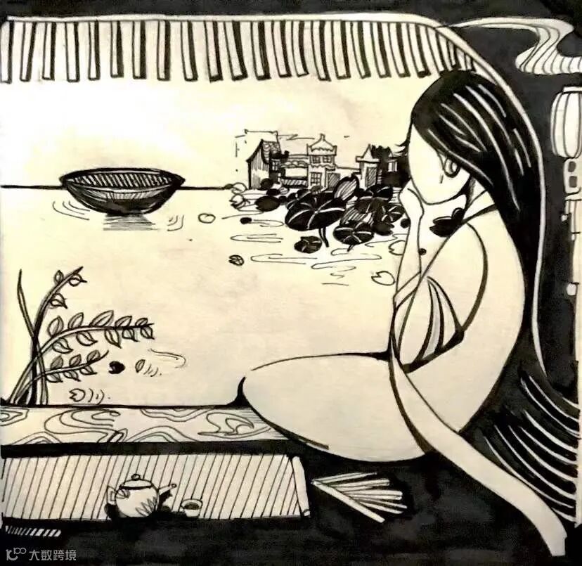 这首诗歌给我带来萧瑟、哀怨的情感氛围,因此我采用黑白装饰画为表达手段,模拟版画的表达形式进行设计,而最后一幅画的湖面留白,更能给人以遗憾的浪漫与无限的遐想。