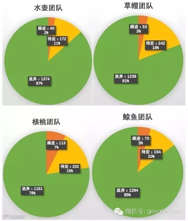 整体数据如此,分团队数据亦如此。四个团队放弃比例在78%-87%之间,尽管每个人的判断标准不同,但是得到的结果却是高度一致。