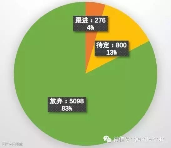 研究工作始于2016年1月12日,完于2016年3月31日,历时78天,没有节假日,共分析6174家挂牌公司,每个团队1500多家公司,每人研究750多家公司。研究结果如下,放弃达5098家,占比为83%,待定和跟进的公司为1076家,占比为17%。