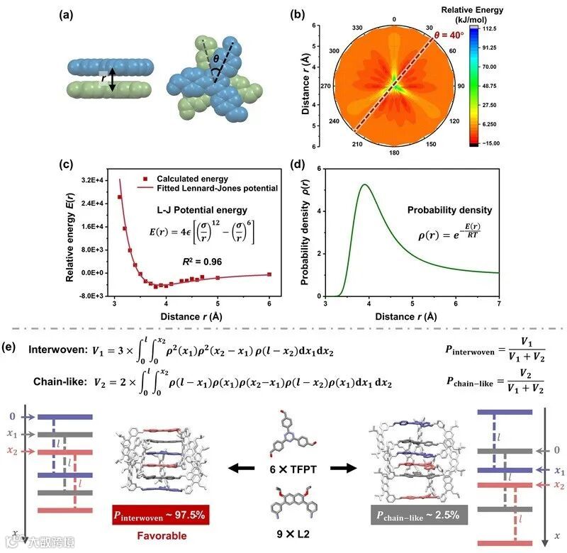 为常数1)时交织结构和链式结构的生成概率分别为60%和40%。为了进一步验证面板之间非共价相互作用的模板效应对笼锁拓扑结构的关键作用,作者随后优化了π-π堆积影响下的概率密度函数来改进统计模型。首先扫描了两个