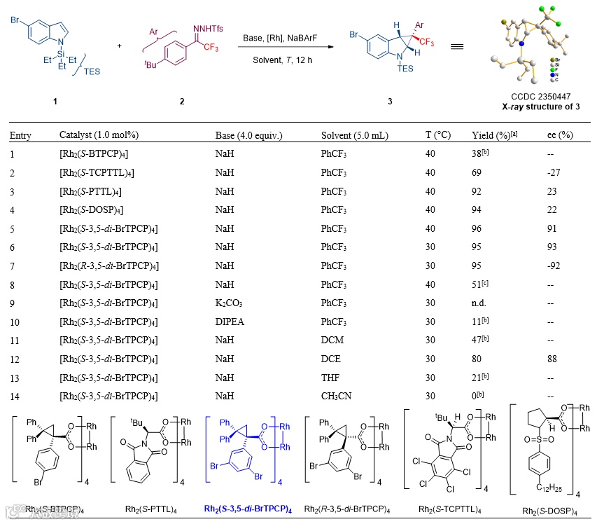导读:东北师范大学毕锡和课题组利用N-邻三氟甲基苯磺酰腙作为三氟甲基卡宾前体,开发了手性铑催化吲哚不对称去芳构化/环丙烷化的策略,合成了一系列具有手性季碳中心的环丙烷稠合吲哚啉化合物