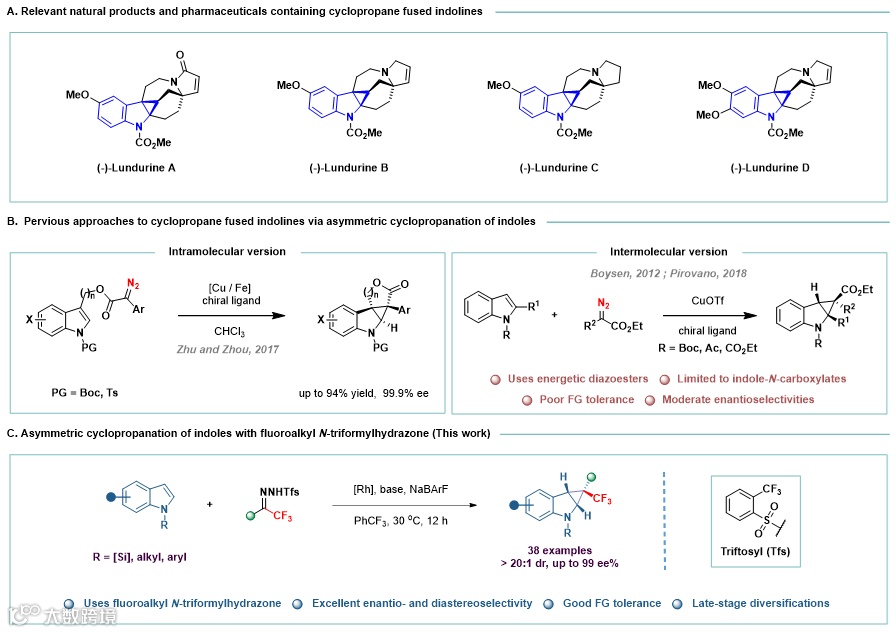 具有立体中心的环丙烷稠合吲哚啉骨架广泛在于许多天然产物和生物活性分子中,也是重要的合成中间体 (图1A)。吲哚的不对称环丙烷化反应是构建环丙烷稠合吲哚啉骨架最有效的方法之一。但是,由于吲哚的平面型结构特征,较难控制反应的对映选择性,致使吲哚的分子间不对称环丙烷化反应仍是一个有待解决的问题(图1B)。
