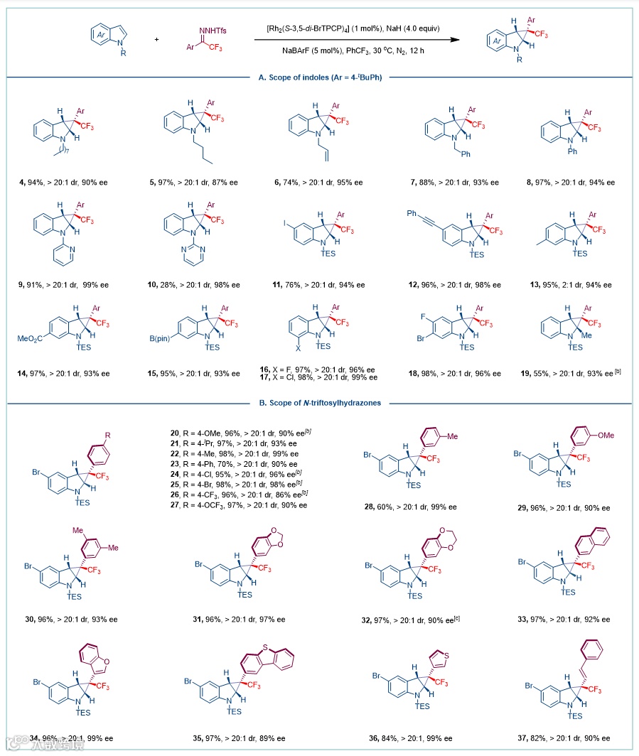 (图1C)。该策略方法简单,能够快速构建多种具有三氟甲基立体中心的环丙烷融合吲哚,具有高产率和高对映选择性(高达99% ee);可耐受各种官能团及用于香叶醇等复杂生物活性分子的后期多样化。所得环丙烷稠合吲哚啉产物可扩环转化为具有