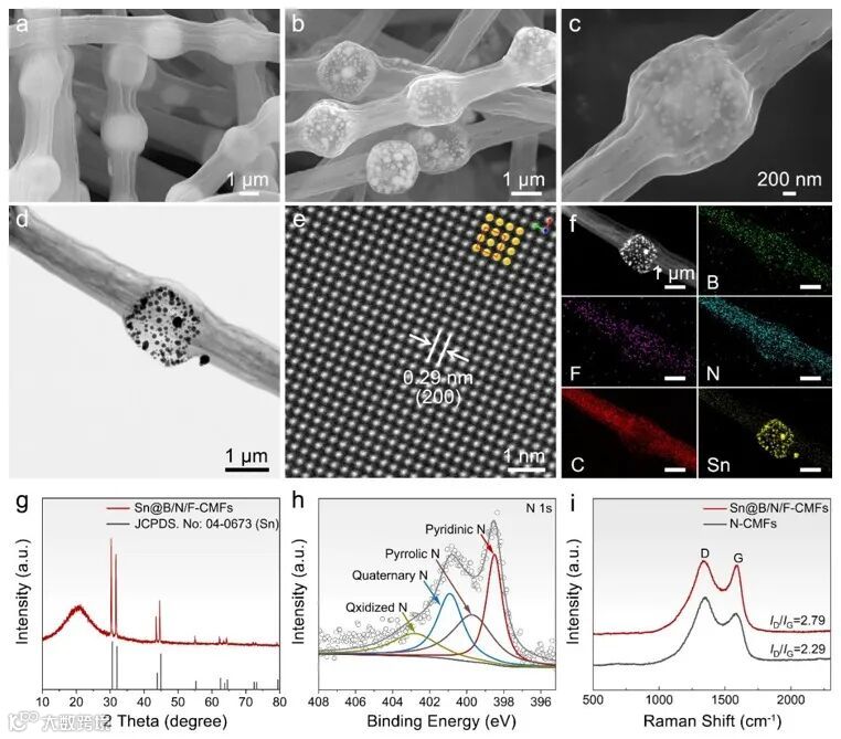 X射线衍射(XRD)图谱证实了锡的形成。经过高分辨扫描电镜(SEM)和透射电镜(TEM)显示,Sn纳米颗粒被封装在碳纤维的立方盒中。元素分布图证实了硼、氮、氟元素的引入。拉曼曲线对比Sn@B/N/F-CMFs和N-CMFs的D带和G带表明Sn@B/N/F-CMFs可促进快速的离子传输。