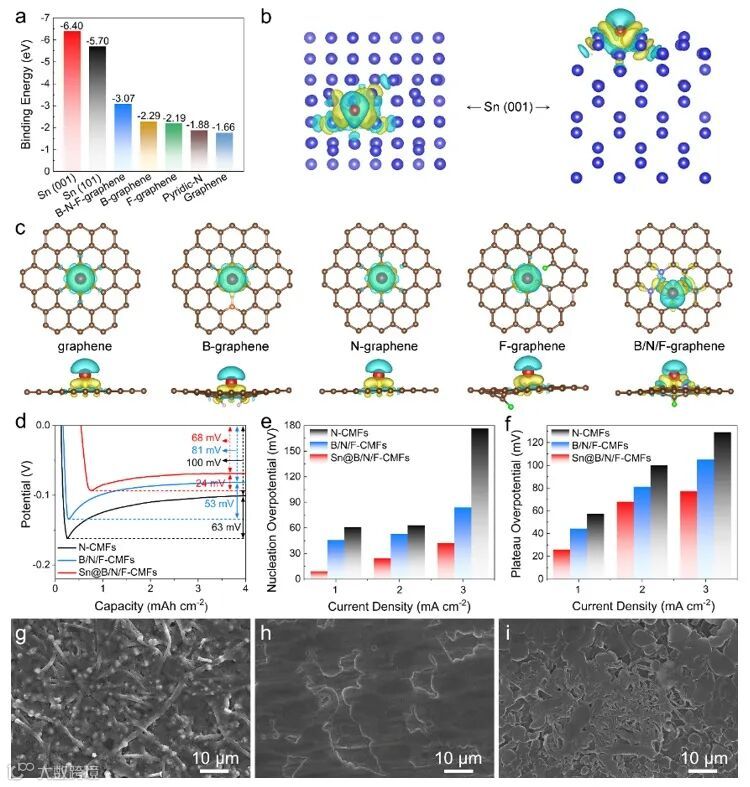 为了研究Sn@B/N/F-CMFs中每种组分对调控锂沉积/剥离行为的作用,作者进行了密度泛函理论(DFT)计算。硼、氮、氟共掺杂的石墨烯样品表现出比裸石墨烯更高的结合能,证实了杂原子掺杂后碳的亲锂性增强。此外,微分电荷密度模型进一步揭示了锂原子与硼、氮、氟共掺杂的石墨烯样品之间的强相互作用,在界面上具有明显的电荷转移。因此,在不同电流密度下,Sn@B/N/F-CMFs集流体与其他宿主相比,具有更低的锂成核和生长过电位。