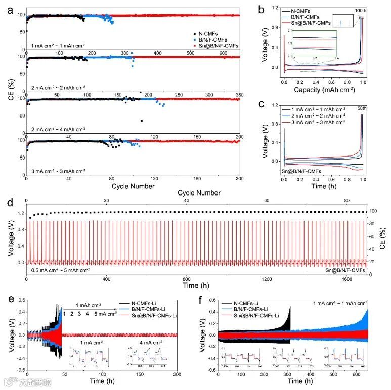 图3. 锂在Sn@B/N/F-CMFs、B/N/F-CMFs和N-CMFs集流体上的锂沉积/剥离行为对比。
