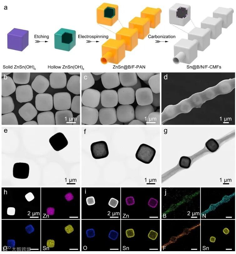 中空盒,采用静电纺丝工艺将中空盒串联,最后热还原成硼、氮、氟共掺杂碳纤维负载锡纳米颗粒的三维集流体。