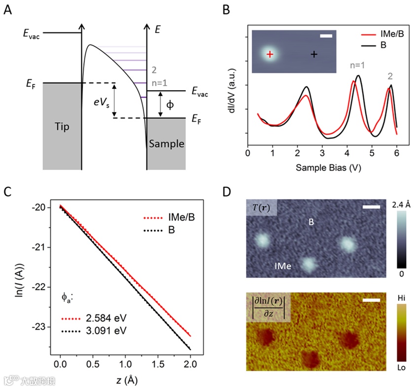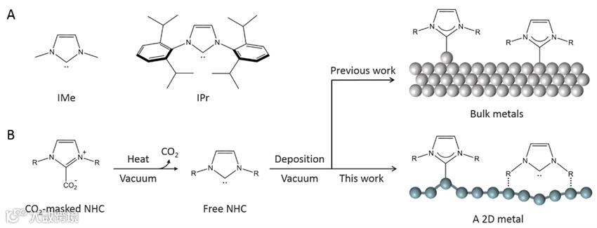 图4. NHC修饰的硼烯的局域功函数测量。除了化学性质之外,NHC对金属表面电子性质的修饰是利用NHC化学进行有机修饰的核心任务之一。本工作利用基于STS的场发射共振谱探测了单个NHC分子吸附对硼烯局域功函数的影响(图A)。单个IMe分子和硼烯表面的场发射共振谱测量表明IMe的吸附引起了硼烯局域功函数的降低(图B)。STM针尖-样品间势垒高度的测量结果进一步证实了该结论(图C),并且实现了硼烯功函数变化的二维成像(图D)。进一步的补充实验表明单个IPr的吸附也会降低硼烯的功函数,但IPr引起的功函数变化幅度要明显小于IMe,这一点与理论计算非常符合。这种对功函数影响的差异性来源于IMe和IPr不同的吸附构型和界面相互作用:IMe的共价修饰和IPr的范德瓦耳斯吸附。 总结展望