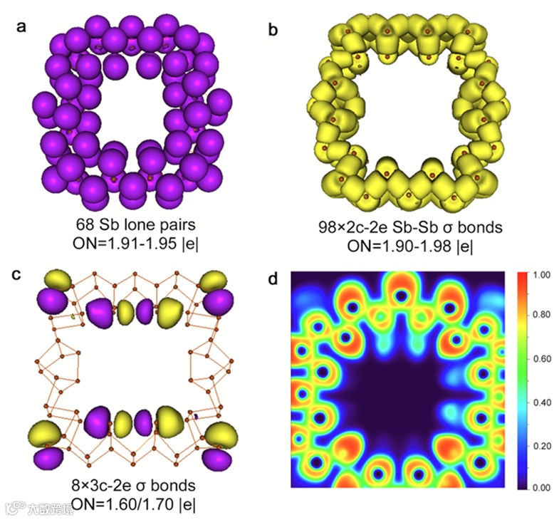 的化学键合模式:(a-b) Lewis键合,包括孤对电子和2c-2e键;(c) 8个Sb-Sb-Sb 3c-2e σ键;(d) S