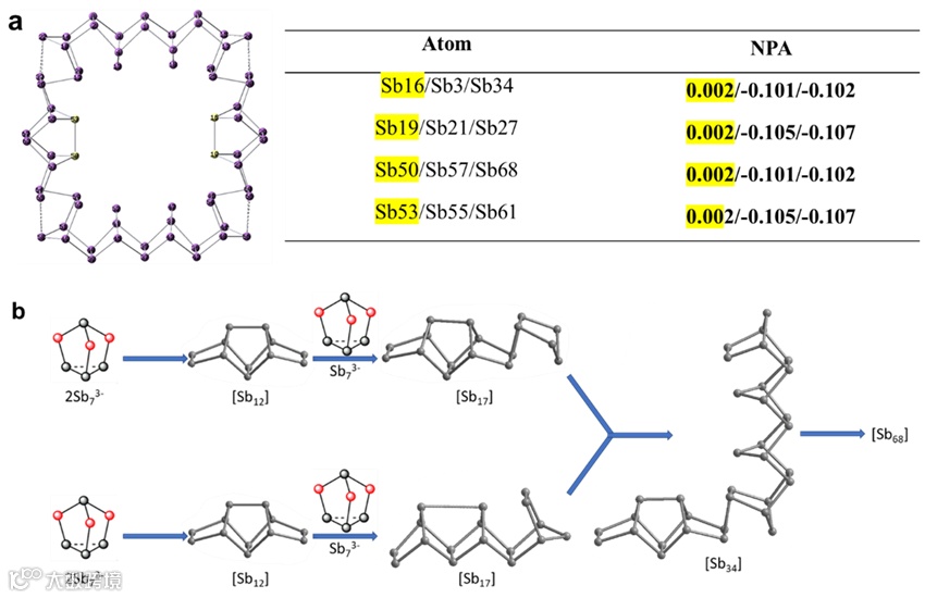 的自然布居分析(NPA)研究其形成机制。在这68个锑原子中,有4个位于纳米环内部的原子带正电荷,并与周围原子发生电荷转移。从这些原子的位置可以检测到S