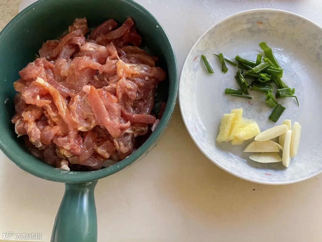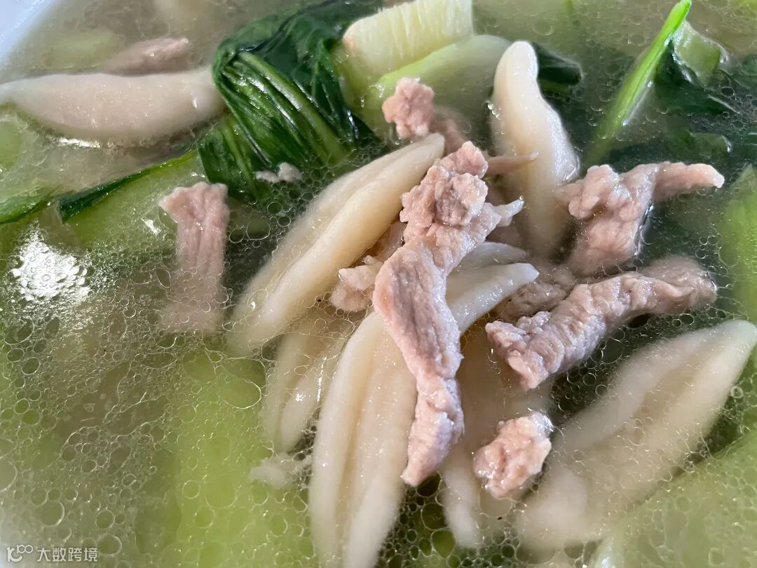 用剪刀将其剪至小块,放入水中煮熟捞出。因为家里有小朋友不吃辣,我就将其做成了简单的青菜肉丝剪刀面。