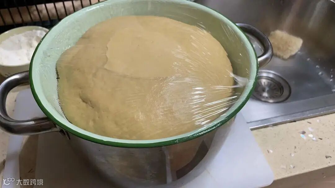 加入50g牛奶,350g面粉(中筋、高筋都可以),用筷子混合后用手揉至光滑,放入盆中并盖上保鲜膜发酵至两倍大。(可以放在温暖处加快其发酵速度)