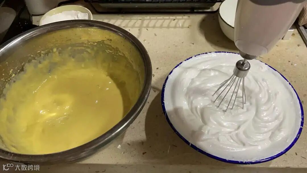 蛋清分3次加入白砂糖打发至可倒扣的奶油状。最后将打发好的奶油状的蛋清分三次加入蛋黄液中搅拌均匀。