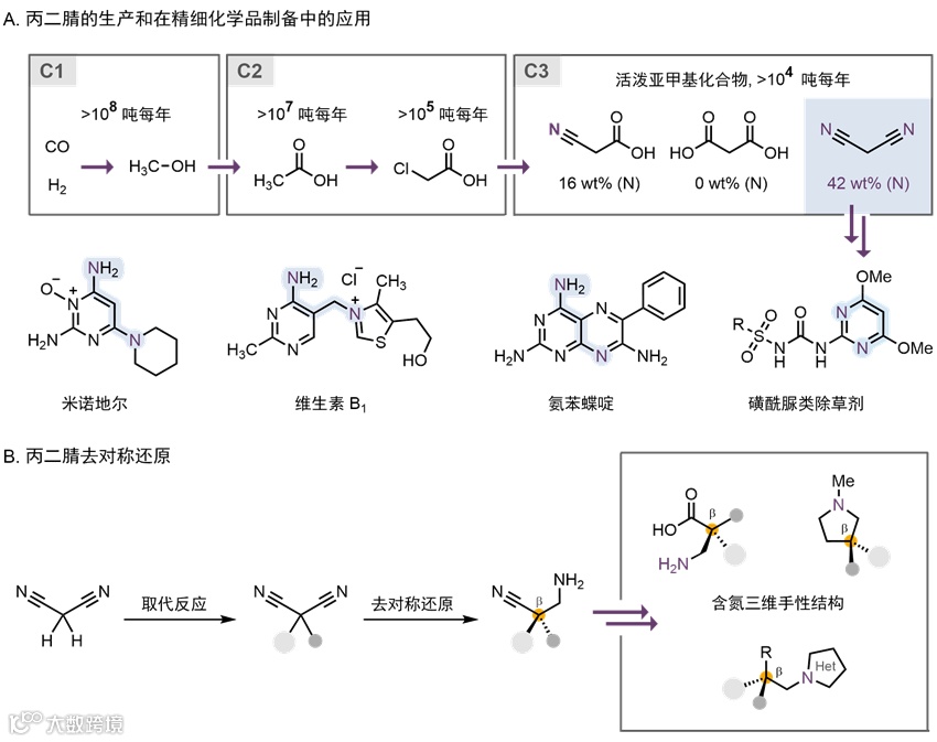 活泼亚甲基化合物是一类年产量超过万吨的工业原料,大量应用于各类精细化学品的生产中。其中,凭借其高氮含量,丙二腈是包括维生素B1、米诺地尔和氨苯蝶啶在内的一系列重要富氮分子的前体。尽管如此,这些终端产物往往是烯烃、杂环等平面分子,而通过丙二腈构建手性三维结构的报道较为少见(图-1A)。虽然丙二腈可以通过多样的取代反应在亚甲基上引入一对取代基来显著提升分子的复杂度,但实现这些取代产物的不对称转化(即去对称化)非常困难。近年来,通过丙二腈的分子内不对称转化构建环状手性中心的反应相继被开发,