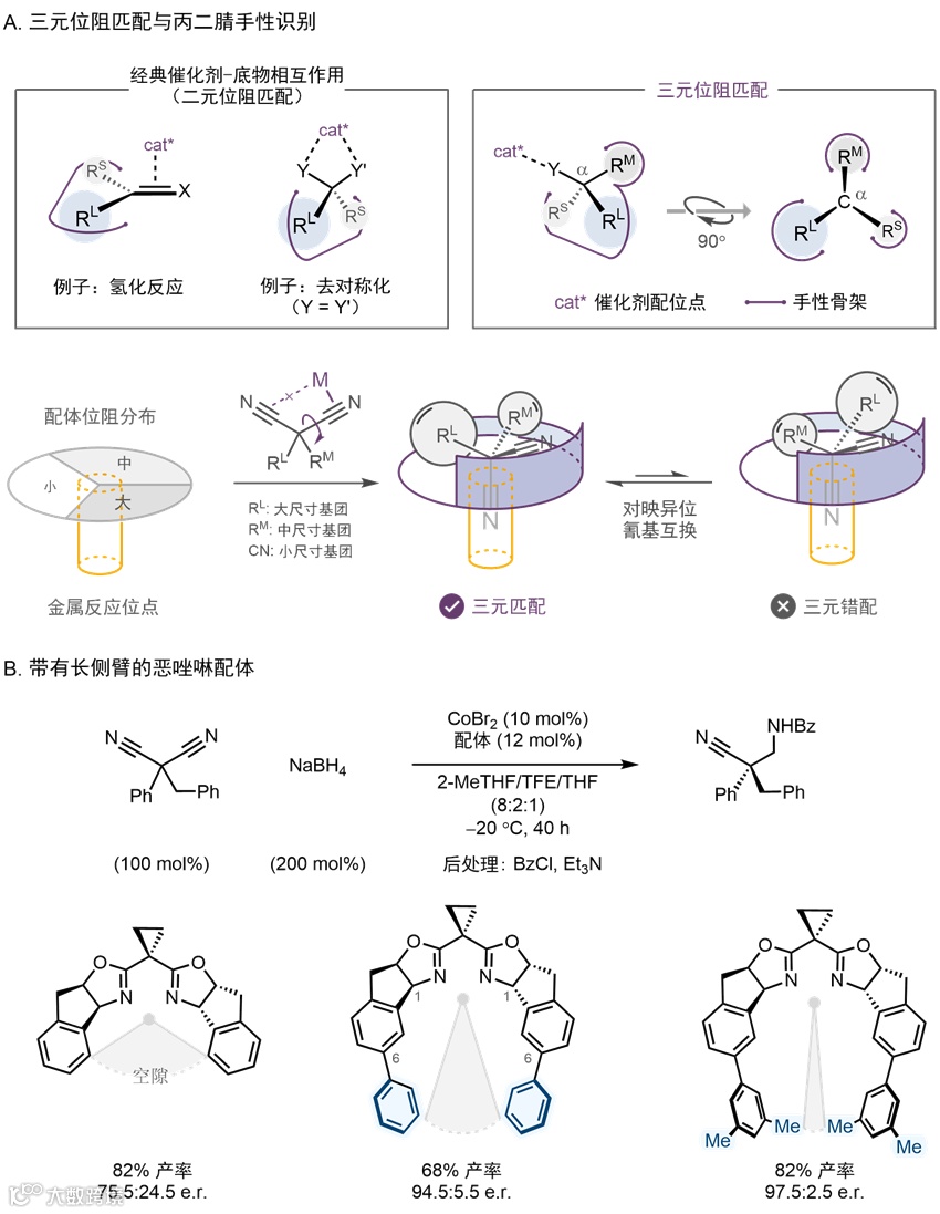四取代碳(例如双取代丙二酸酯)的识别则经常借助于两个取代基对于催化剂的螯合来限制碳碳单键的旋转,并在此基础上识别剩余的两个基团。由于其线性构型,丙二腈中的一对氰基很难同时与金属配位来稳定构象,因而不能套用上述催化剂-底物