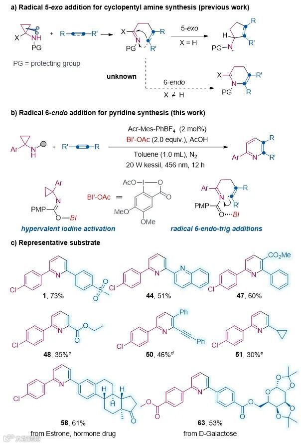自由基加成,实现了无金属条件下吡啶的高效合成(图1b)。该方法与多种末端和取代炔烃兼容,以优异的区域选择性得到了结构多样的吡啶衍生物(图1c)。