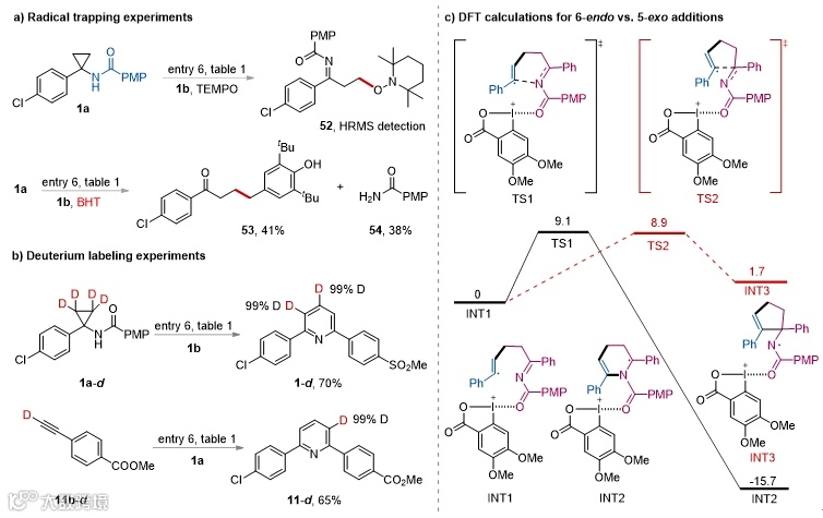 作者对反应的机理进行了详细的研究。模板反应中加入自由基抑制剂,可分别捕获到亚胺远端烷基自由基以及中间被捕获后水解的产物(图2a)。氘代标记实验表明实验过程中生成的烷基自由基和烯基自由基未经过异构化,而是直接发生自由基加成、环化和芳构化(图2b)。密度泛函理论 (DFT) 计算表明高价碘对烯基自由基的6-