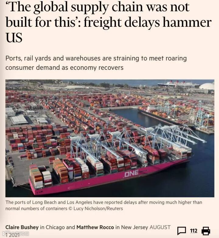 英国金融时报(Financial Times)近期就刊文称,由于进口猛增,美国的铁路站场、港口和仓库已经被货物挤得水泄不通。由于人手太少,无法快速运输,“货运拥堵正重创美国”,企业和消费者正面临更广泛的通胀压力。另有数据显示,在美国10个最繁忙港口中,当前至少有7个面临拥堵。这其中,需求是影响因素之一,另一方面是因为美国的港口、码头工人效率过低。在中国的洋山、青岛和盐田等港口,移动一个集装箱平均需要24秒,而在洛杉矶则需要48秒。