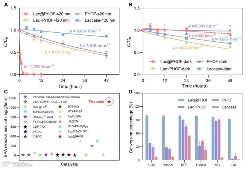 在可见光、不添加牺牲剂的条件下,设计的超分子光-酶偶联催化剂对酚类污染物的催化降解速率比天然漆酶提升2个数量级,也优于先前报道的纳米催化剂(图2)。Lac@PHOF具有出色的结构和功能稳定性,在污染物加标水体中重复工作10次后仍能保持几乎100%的催化降解速率。研究人员通过凝胶化策略将Lac@PHOF加工成易于分离、回收的催化微球,成功应用于河水、湖水及污水处理厂废水中酚类污染物的高效、可持续净化。鉴于漆酶来源广泛、成本低廉的特点,该超分子光-酶偶联催化体系有望为复杂水体环境的污染控制提供新技术。