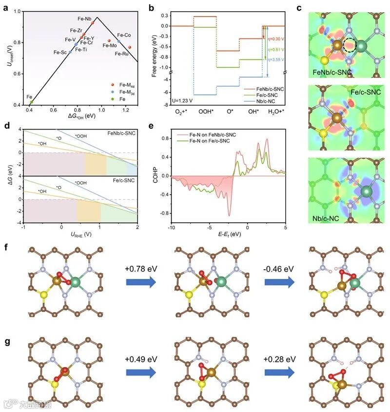 基于FeNb/c-SNC的ZAB在423.2 mA cm−2下的峰值功率密度为314.3 mW cm−2。在20 mA cm−2的充放电循环中,基于FeNb/c-SNC的ZAB可以保持1000小时以上的稳定性能,超过了之前报道的大多数双金属催化剂中的ZAB。这些结果清楚地表明,Nb原子的引入不仅提高了ZAB性能,而且提高了电池的长期稳定性。作者以FeNb/c-SNC为阴极催化剂,PtRu/C为阳极催化剂制备了膜电极组件(MEA),探索了其在实际HEMFC中的应用潜力。FeNb/c-SNC MEA的峰值功率密度达到1.18 W cm−2,远远超过Fe/c-SNC MEA的0.71 W cm−2。这些结果表明,FeNb/c-SNC不仅具有优异的内在ORR性能,而且在实际电池器件中具有很大的应用潜力。