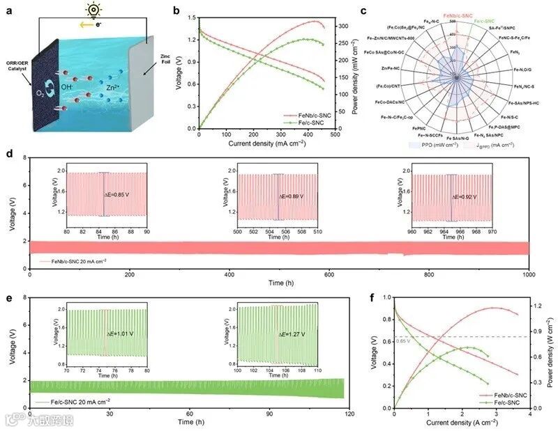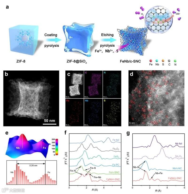 图1. Fe-Nb/c-SNC的合成示意图及形貌表征。 FeNb/c-SNC催化剂表现出优异的电池性能和稳定性