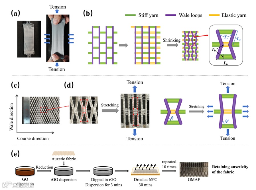图1. 负泊松比织物应变传感器设计及制造。a) 具有正泊松比的传统织物。b) 具有内凹六边形单元的负泊松织物结构设计。c)织物照片。d)织物在纵向拉伸时双向膨胀示意图。e)传感器制备示意图。