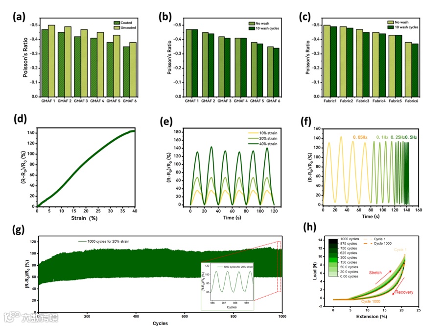 图2. 负泊松比织物应变传感器性能。a)石墨烯涂层和未涂层织物的泊松比值。b)传感器在 10 次洗涤周期前后的泊松比值。c) 未涂层织物在 10 次洗涤周期前后的泊松比值。d) 负泊松比织物应变传感器的相对电阻变化。e) 在 0.05 Hz 的频率下对 10%、20% 和 40% 的应变的响应。f) 在 0.05 Hz、0.1 Hz、0.25 Hz 和 0.5 Hz 的不同频率下对 40%应变的响应。g)传感器在 20% 的应变下拉伸 1000 次循环。h) 1000次拉伸循环下的拉伸回复曲线。