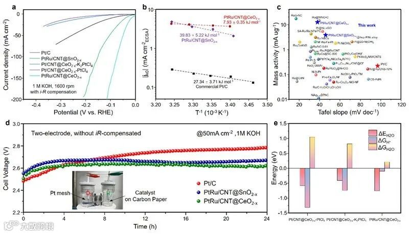 催化剂HOR/HER交换电流密度的阿伦尼乌斯图;(c)Tafel斜率和质量活性与文献催化剂的比较;(d)Pt/C,PtRu/CNT@Sn