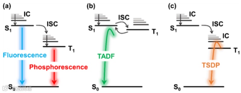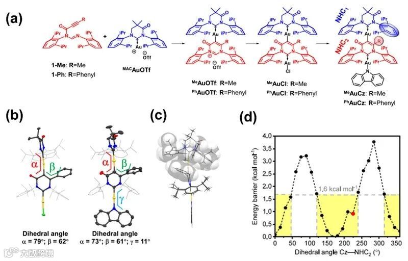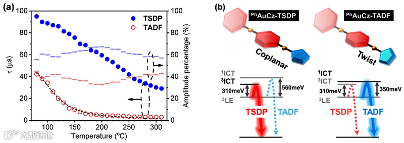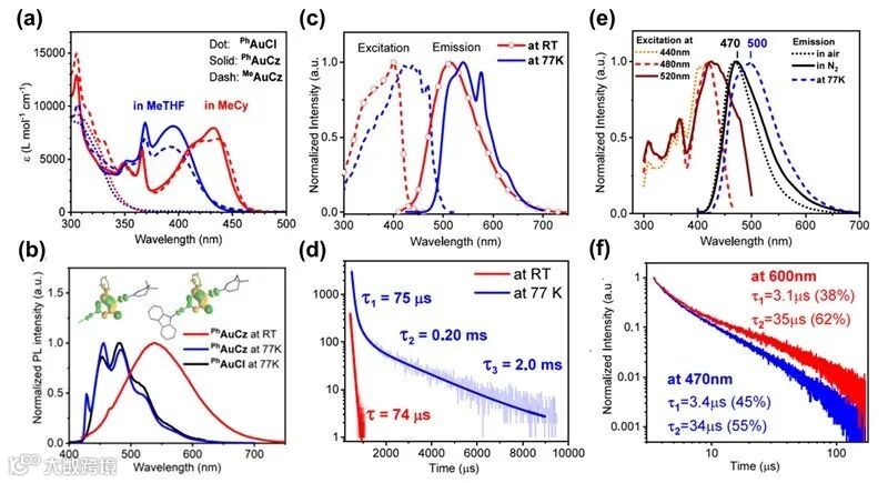 为1.2 × 107 s−1。PhAuCz的磷光τ2从90 μs降到30 μs左右,这由于随着温度的升高,IC速率增加,导致寿命降低。两个辐射跃迁分别对应NHC2和Cz之间具有扭曲和共面的基态构象。35 μs与在PhAuCz单晶样品中的寿命相当,与NHC2-Au-Cz较小二面角的PhAuCz构象(简称PhAuCz-TSDP)相关,3.0 μs辐射寿命与具有较大NHC2-Au-Cz二面角的PhAuCz构象(简称PhAuCz-TADF)相关。在整个温度范围内,两种构象的百分比几乎不变,PhAuCz-TADF和PhAuCz-TSDP的百分比分别约为40%和60%。