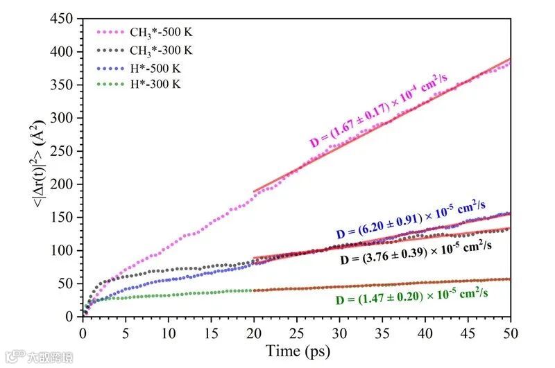 图3. H/CH3随时间演化的均方扩散位移(<|Δr(t)|2>)和相应的热扩散系数(D)。