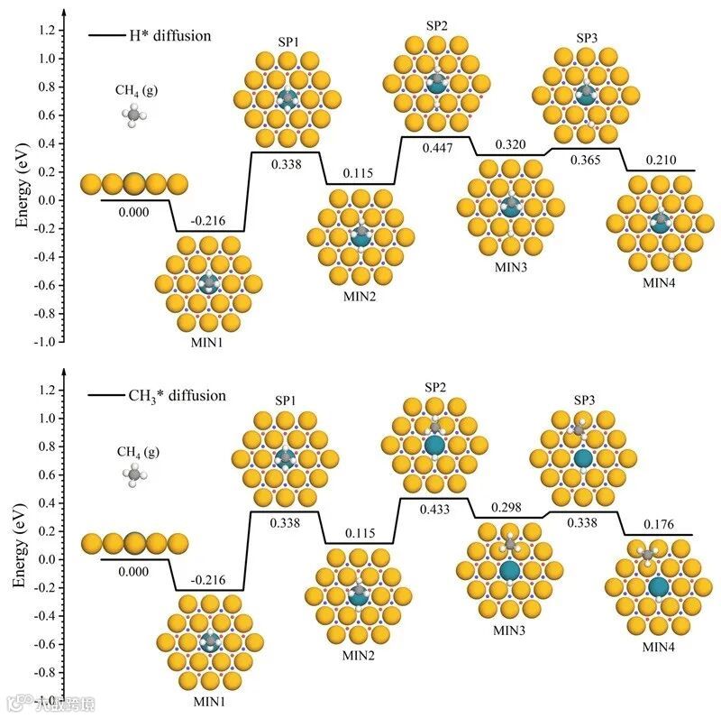 图1. Rh/Cu(111) SAA表面上CH4 解离和H*/CH3*扩散的反应路径。