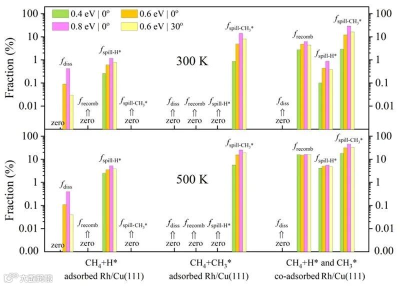 图4. CH4气体环境下,H/CH3吸附的Rh/Cu(111)表面上CH4解离(fdiss)、CH4重组(frecomb)、H溢流(fspill-H)和CH3溢流 (fspill-CH3) 的概率。