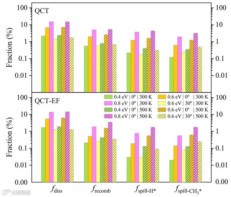 图2. 不同初始条件下,Rh/Cu(111) SAA表面上CH4的解离概率,H/CH3的溢流概率和CH4重组的概率。