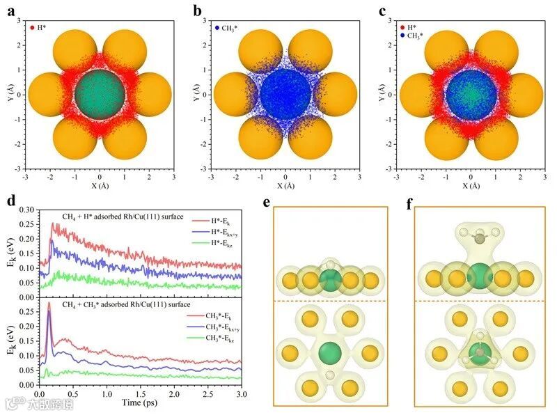 为了促进吸附物种的溢流,作者采用QCT-EF方法模拟了CH4和Rh/Cu(111)表面H/CH3吸附物种的碰撞过程。如图4所示,碰撞可以有效地促进H和CH3溢流。并且有趣的是,CH3比H具有更大的溢流概率。进一步研究发现,碰撞让H/CH3获得了足够克服溢流能垒的能量 (图5d)。通过电荷密度等值面分析发现CH3比H具有更大的碰撞截面 (图5e和5f),从而更容易获得能量,展现出显著的溢流优势。