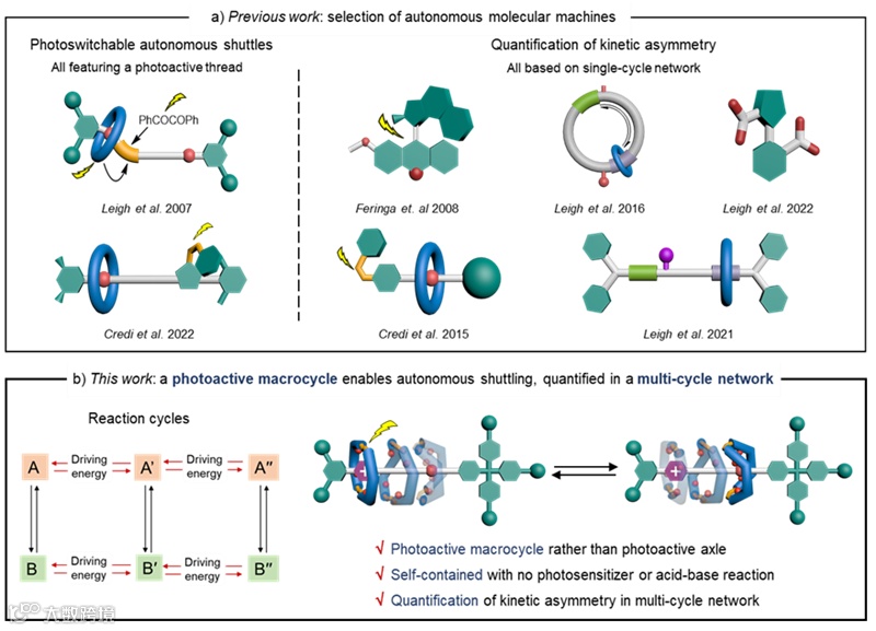 。近几十年来,科学家设计合成了不同类型的自动人造分子机器用于模仿生物机器的运行过程。然而,迄今为止,无论是光驱动的还是化学驱动的自动人造分子机器,其运行都是基于简单的单循环化学反应网络(图1)。因此,为了理解生物分子机器的复杂运行机制,设计具有多循环反应网络特征的人造分子机器具有重要意义。