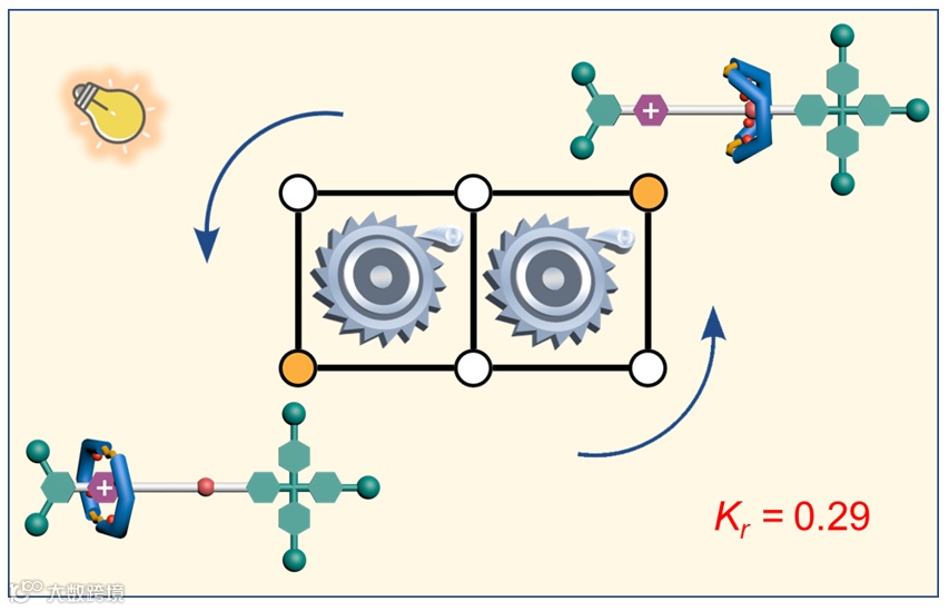 )之间的可逆穿梭。当对其施加光刺激时,大环发生异构化并伴随着环的尺寸变化,异构化后大环对轴线上不同位置的两个结合位点的相对亲和力发生反转,最终导致大环在轴线上的偏置分布(图2)。
